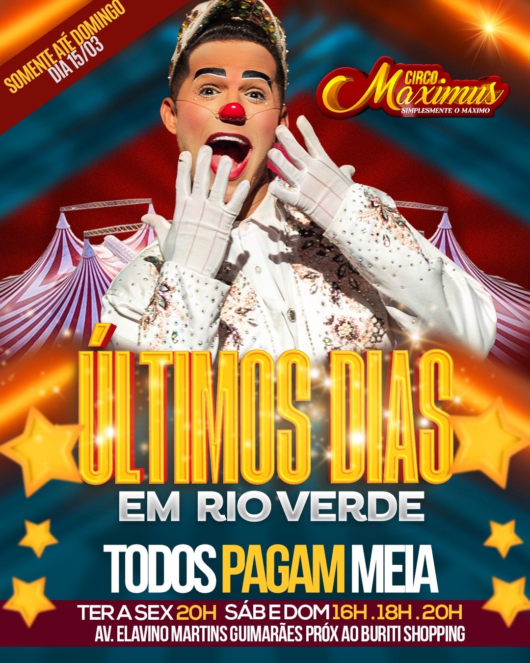 | Ingresso Circo Maximus FERIADO | Rio Verde – GO | 17/02/2026 – Terça-Feira 2ª Sessão 18:00hs | R$ 16,50 – R$ 330,00Price range: R$ 16,50 through R$ 330,00 → Incluso taxa de compra online |