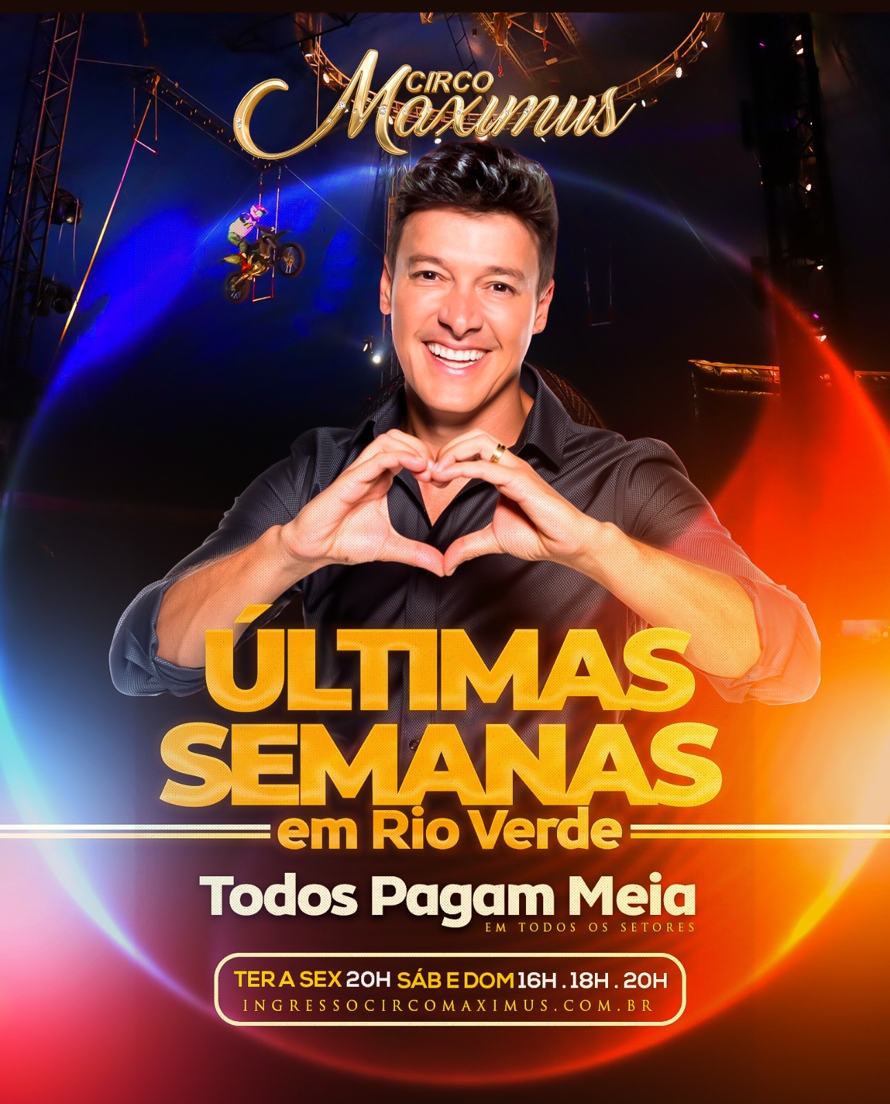 | Ingresso Circo Maximus | Rio Verde – GO | 08/03/2026 – Domingo 3ª Sessão 20:00hs | R$ 22,00 – R$ 220,00Price range: R$ 22,00 through R$ 220,00 → Incluso taxa de compra online |